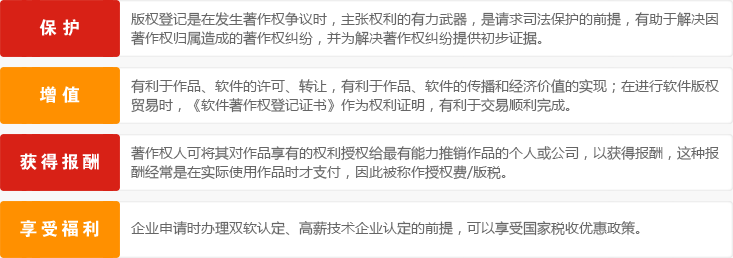 國家著作權(quán)行政管理部門鼓勵著作權(quán)人進行計算機軟件著作權(quán)登記,并對已登記的軟件給予重點保護。軟件著作權(quán)登記證書是對登記事項的初步證明,可以幫助持有者在訴訟中祈禱減輕舉證責(zé)任的作用。根據(jù)國務(wù)院頒發(fā)的《鼓勵軟件產(chǎn)業(yè)和集成電路產(chǎn)業(yè)發(fā)展的若干政策》的有關(guān)規(guī)定,證書可以作為軟件企業(yè)減免稅收的證明。