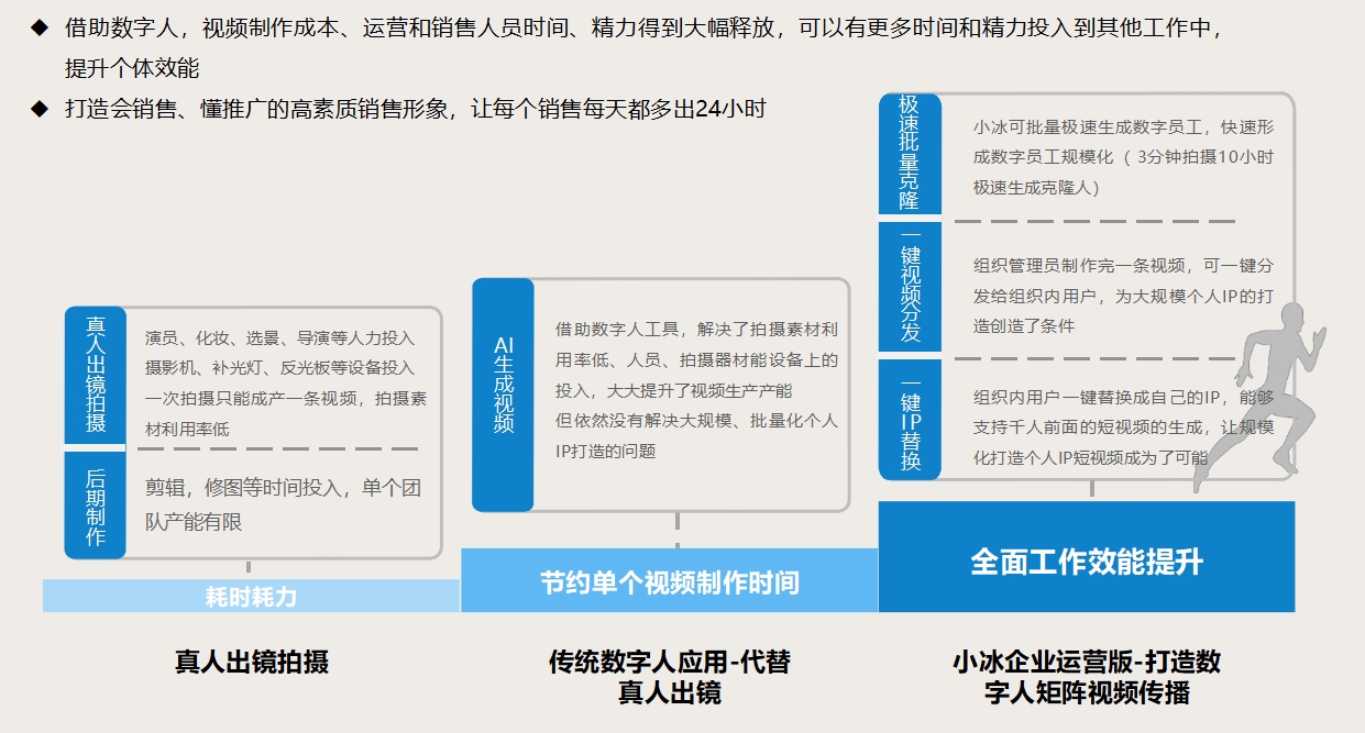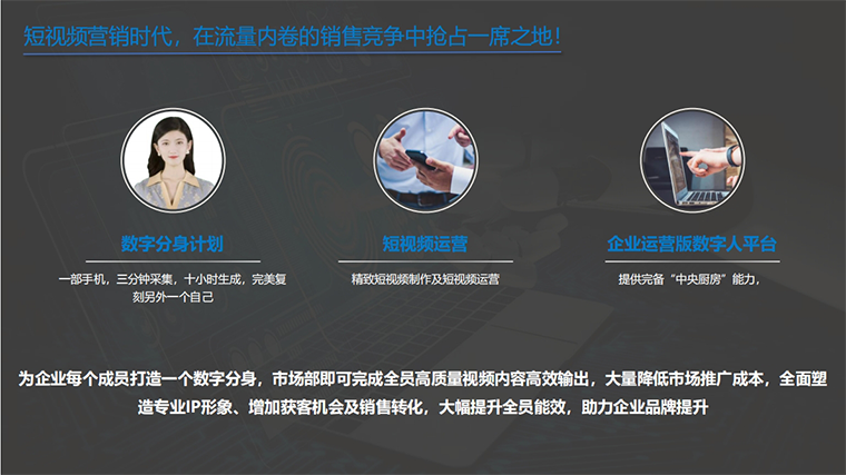 企業(yè)智能版數(shù)字人是在AI數(shù)字人的基礎(chǔ)上專為公司設(shè)計(jì)的一款產(chǎn)品。企業(yè)智能版數(shù)字人為企業(yè)每個(gè)成員打造一個(gè)數(shù)字分身,結(jié)合“一鍵制作”的管理系統(tǒng),快速制作出每個(gè)成員的數(shù)字視頻,減少傳統(tǒng)制作視頻所需時(shí)間和費(fèi)用,以其“中央廚房”的系統(tǒng)優(yōu)勢為企業(yè)吸引銷售人才,讓銷售和宣傳并行,節(jié)省市場推廣成本,解決銷售私域&公域潛在客戶觸達(dá)率低的問題。