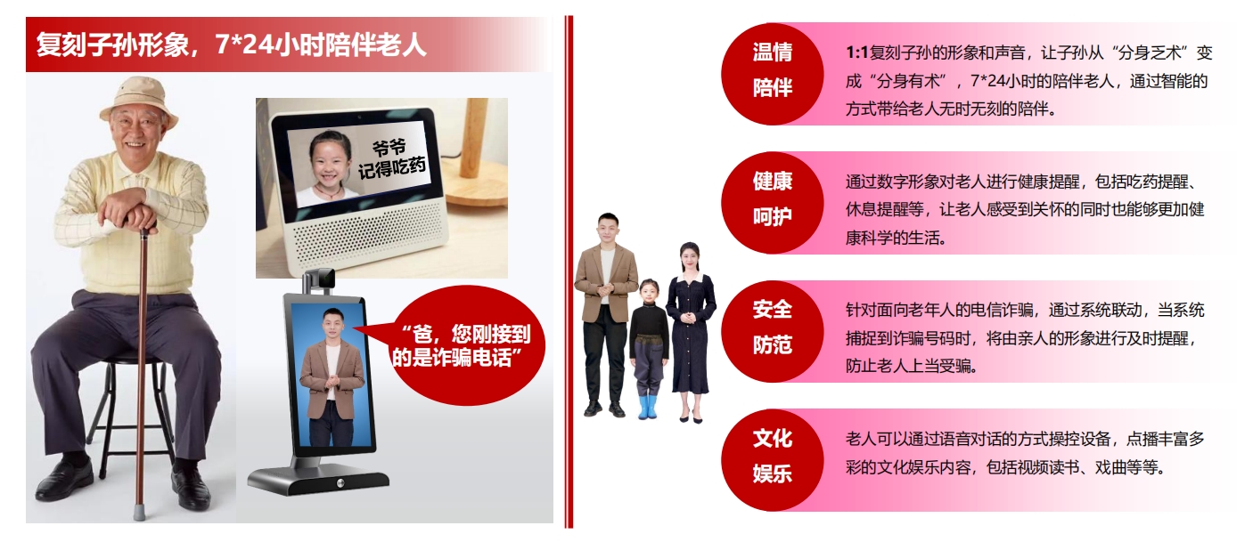 1.以子孫形象陪伴老人,信息化方式呵護(hù)老人。復(fù)刻子孫形象聲音,以親切的方式陪伴老人,并提供健康、安全、文化娛樂等豐富服務(wù),通過智慧化的方式呵護(hù)老人,幫助老年人跨越數(shù)字鴻溝,安享晚年生活。